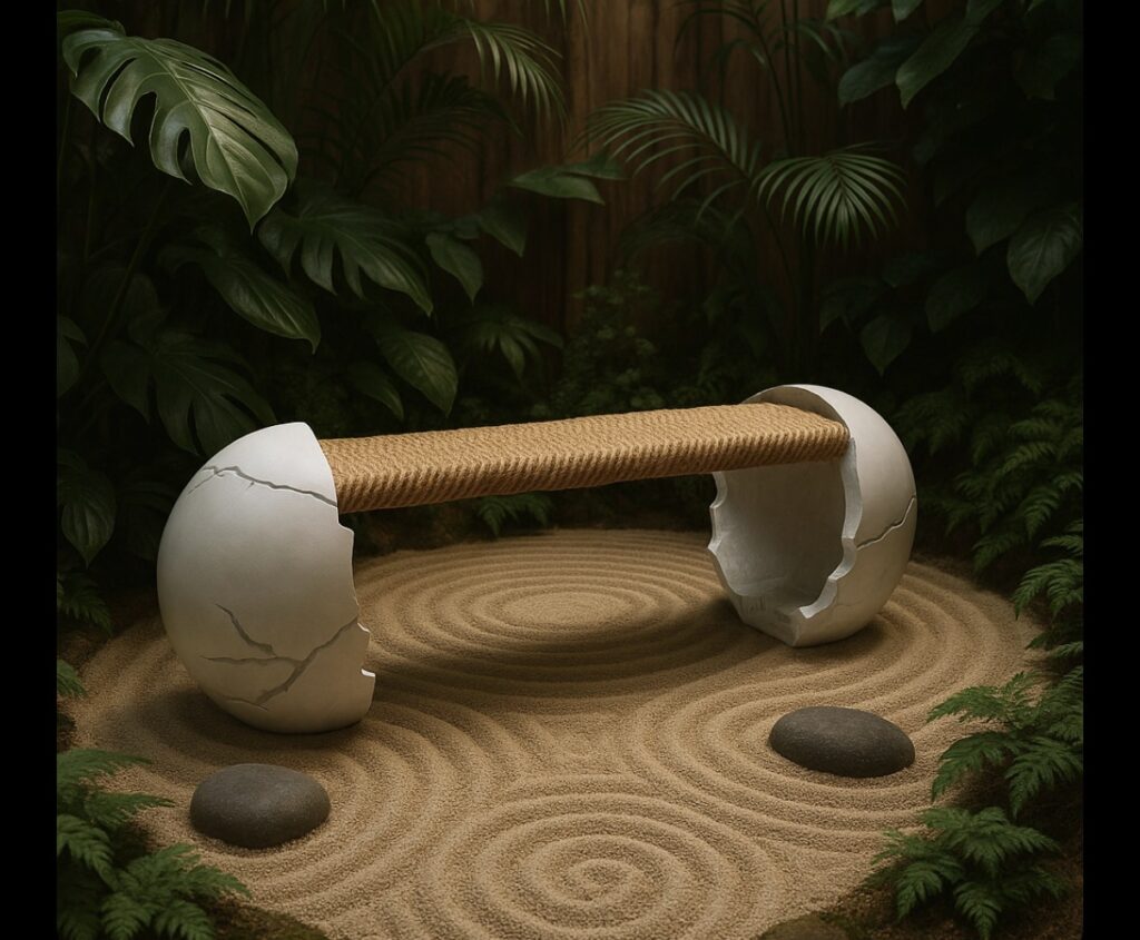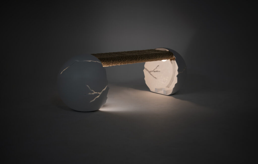 Shaped by the delicate contours of a broken eggshell, this recyclable bench transforms illuminated cracks into lines of renewal, revealing the quiet strength and beauty within imperfection.