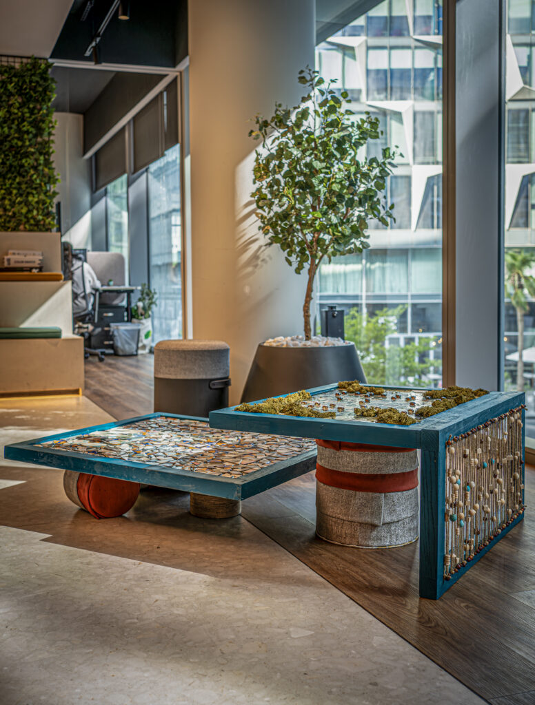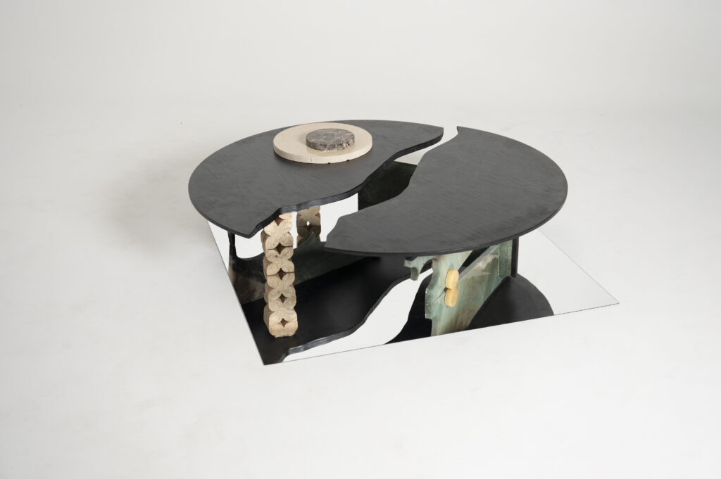 Crafted from reclaimed stone and rescued materials, this flexible coffee table splits, shifts, and transforms with ease-turning discarded fragments into a stylish, sustainable centerpiece.