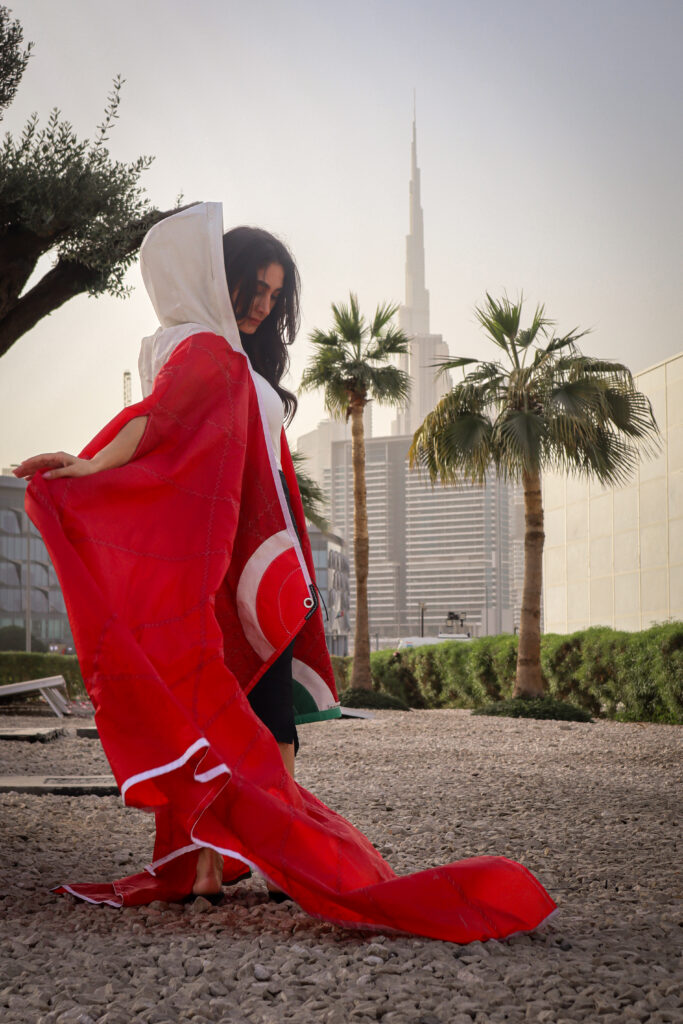 Made from reclaimed sail fabrics, this wearable shelter turns the UAE’s sailing heritage into practical, sustainable protection-giving used materials a meaningful second life.
