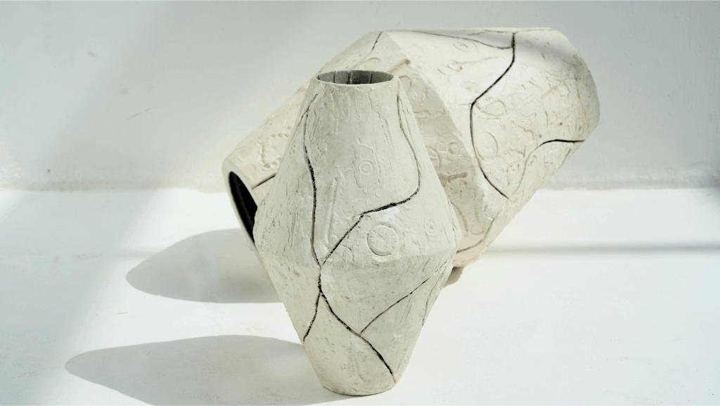 Crafted from recycled plaster and crushed glass, these sculptural lamps let light pour through their cracks, turning the weight of struggle into a quiet radiance of renewal.